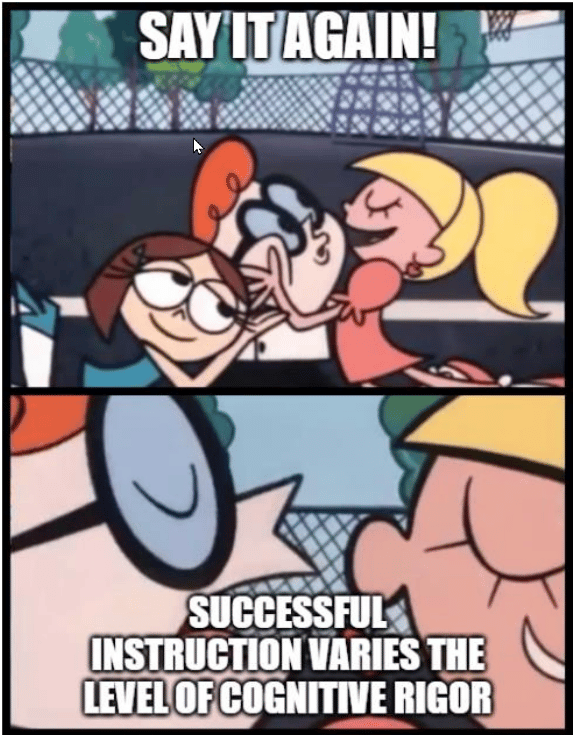 | Hey everyone,  I had a bunch of inspiring conversations about objective writing at the conference (yes, I’m apparently not the only person who gets excited about this), and I realized something: a lot of us are haunted by the same ghost, low-level cognitive rigor. 👻 You know the ones: “Students will identify...” “Students will define...” There’s nothing wrong with these, we need foundational objectives. But if that’s where the learning ends, your students are stuck in Bloom’s Basement. The Ladder Out of the Grave I’ll spare you the full Bloom’s Taxonomy lecture (the 2001 revision is the one you want, with learner action verbs), but here’s the key point: Learning isn’t a climb, it’s a motion. (I ran out of formatting options to emphasize this, boo) Students move up and down the levels of rigor as they grow. Let me reinforce this with a short tangent. I once applied for a job leading workforce development in an industry where — let’s just say — the average individual still used AOL (change is scary to them). I built this meme into my presentation for them to make a point about scaffolding rigor: No one laughed. (Apparently there was a 25-year humor gap between us.) But I got the job, because the point stuck: You can’t jump straight from remembering to creating. There are four levels of cognitive rigor between, and learners need a scaffold to reach the top. How National Standards Trick AND Treat You National Core Arts Anchor Standard #5: Develop and refine artistic work for presentation Treat: They push us toward high-rigor learning — Create and Evaluate. Trick: Tossing this at them and assessing your ensemble in May is NOT rigorous, it’s a horror story. To get there, you need both terminal and enabling objectives: Terminal = the high-rigor destination Remember Identify musical elements that influence performance quality (dynamics, articulation, phrasing) Understand Describe how specific musical choices on elements affect audience perception Apply Rehearse a selected passage, targeting a musical element and applying feedback Analyze Compare two performances of the same piece to differentiate interpretation of elements Evaluate Critique a recorded performance of yourself using a rubric to improve artistic communication Create (Terminal Objective) Develop and refine artistic work for presentation “But You Said Learning Moves Up and Down…” Jeez, give me a minute... One day you start expanding dynamics (Identifying fortissimo and pianissimo), then you describe how to use extended dynamics, and rehearse and compare dynamic contrast. Can you Evaluate a recording against a rubric at that point?  So you go back and repeat the low rigor scaffolding 2 more times with articulation and phrasing. Now, you reach Evaluate and actually have higher cognitive rigor because you’re applying and synthesizing a variety of elements that impact performance, what the standard is truly aiming for. Strategies for Varying Cognitive Rigor 📍Plan high, Start Low Start by outlining all of your large chunks first (terminal objectives, the big ones), then break them into scaffolded enabling objectives. It keeps your course outcomes validated and aligned, making granular planning way easier, proven, and trusted. 📊 Align Assessments with Rigor: Assess to the rigor: